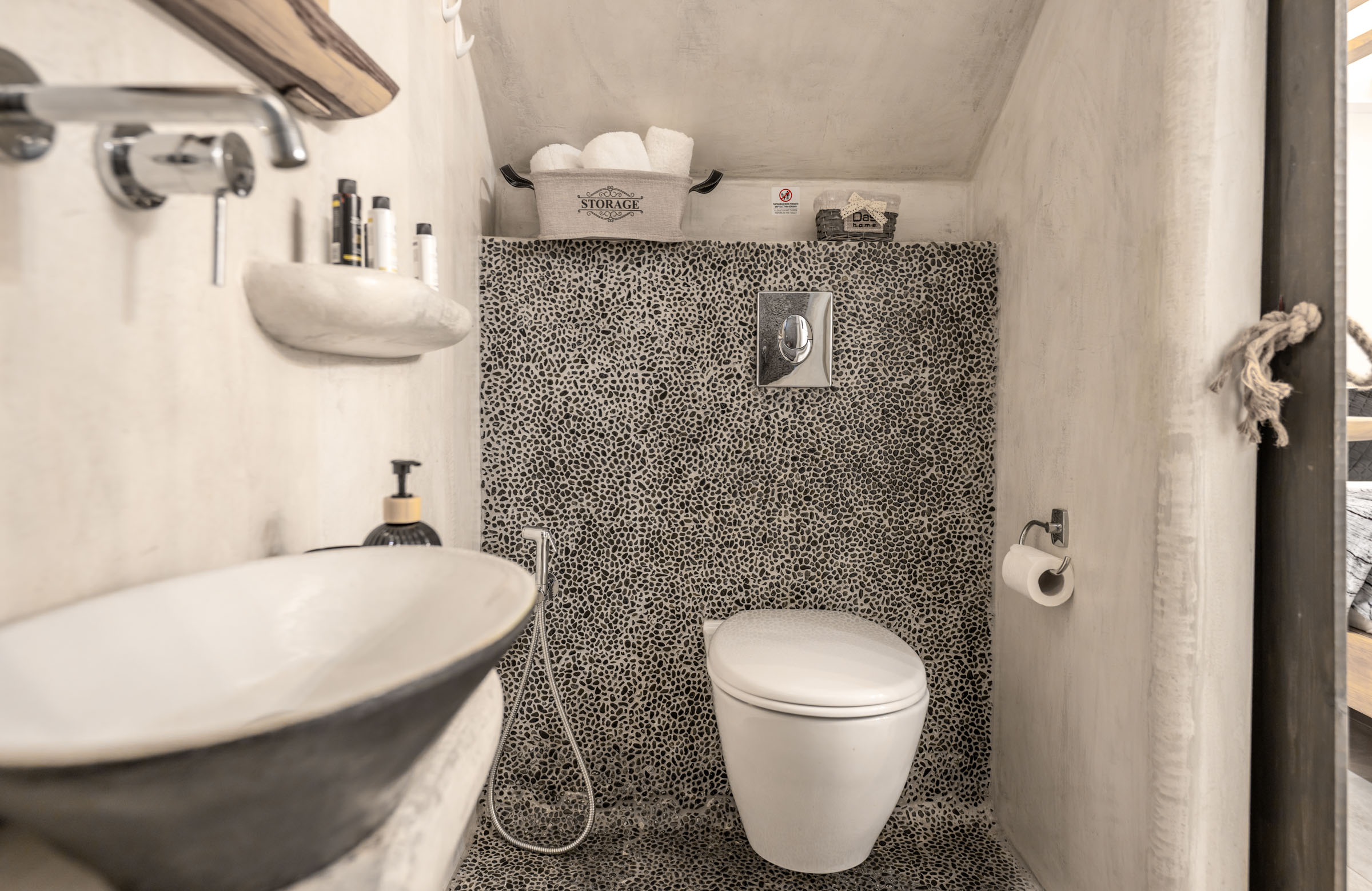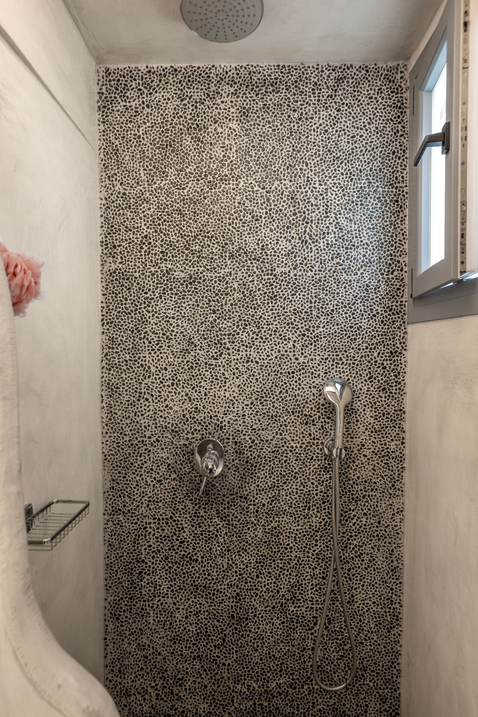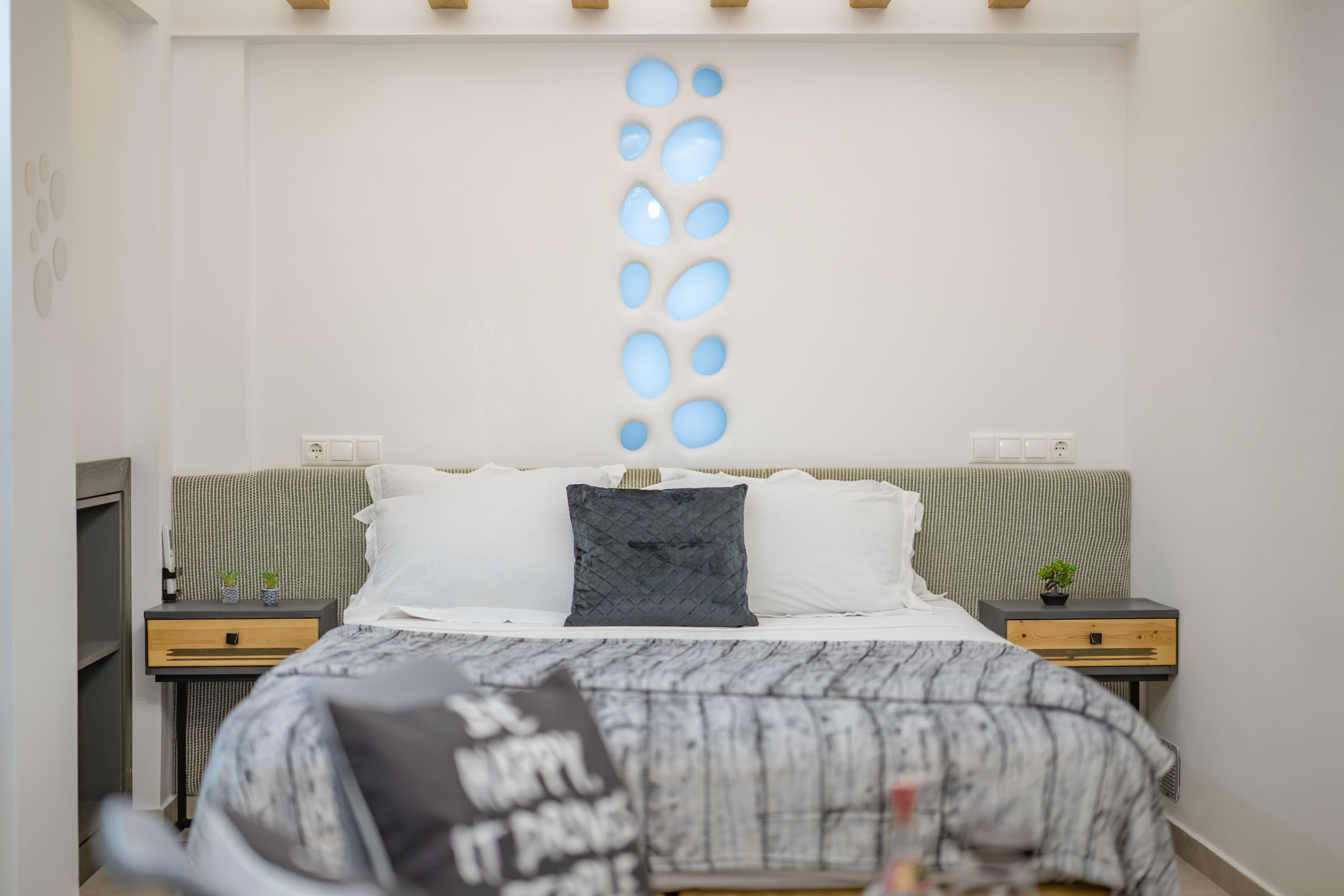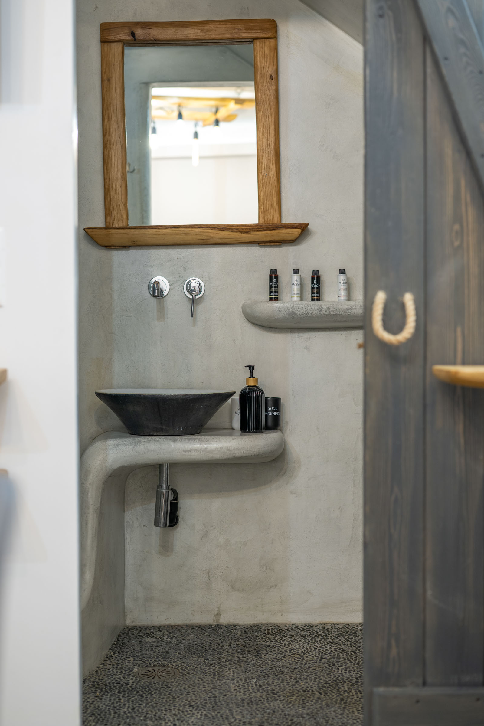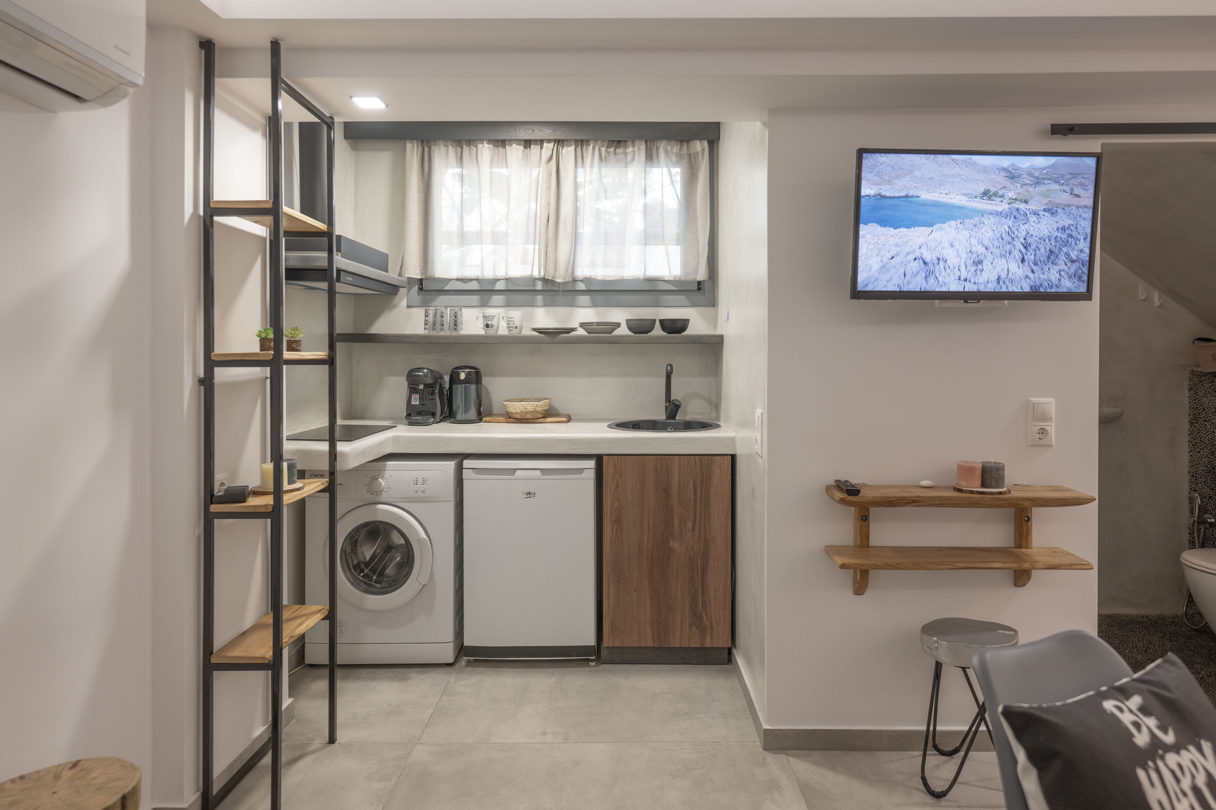 The Deluxe Double Suite is a thoughtfully designed space that blends rustic elegance with contemporary comfort. Located on the lower level, it features soft lighting, natural textures, a stylish lounge area, and a fully equipped kitchenette. Whether you’re unwinding with a glass of wine or waking up to peaceful Cycladic vibes, this suite is the perfect retreat for couples seeking a cozy yet elevated Naxos experience.